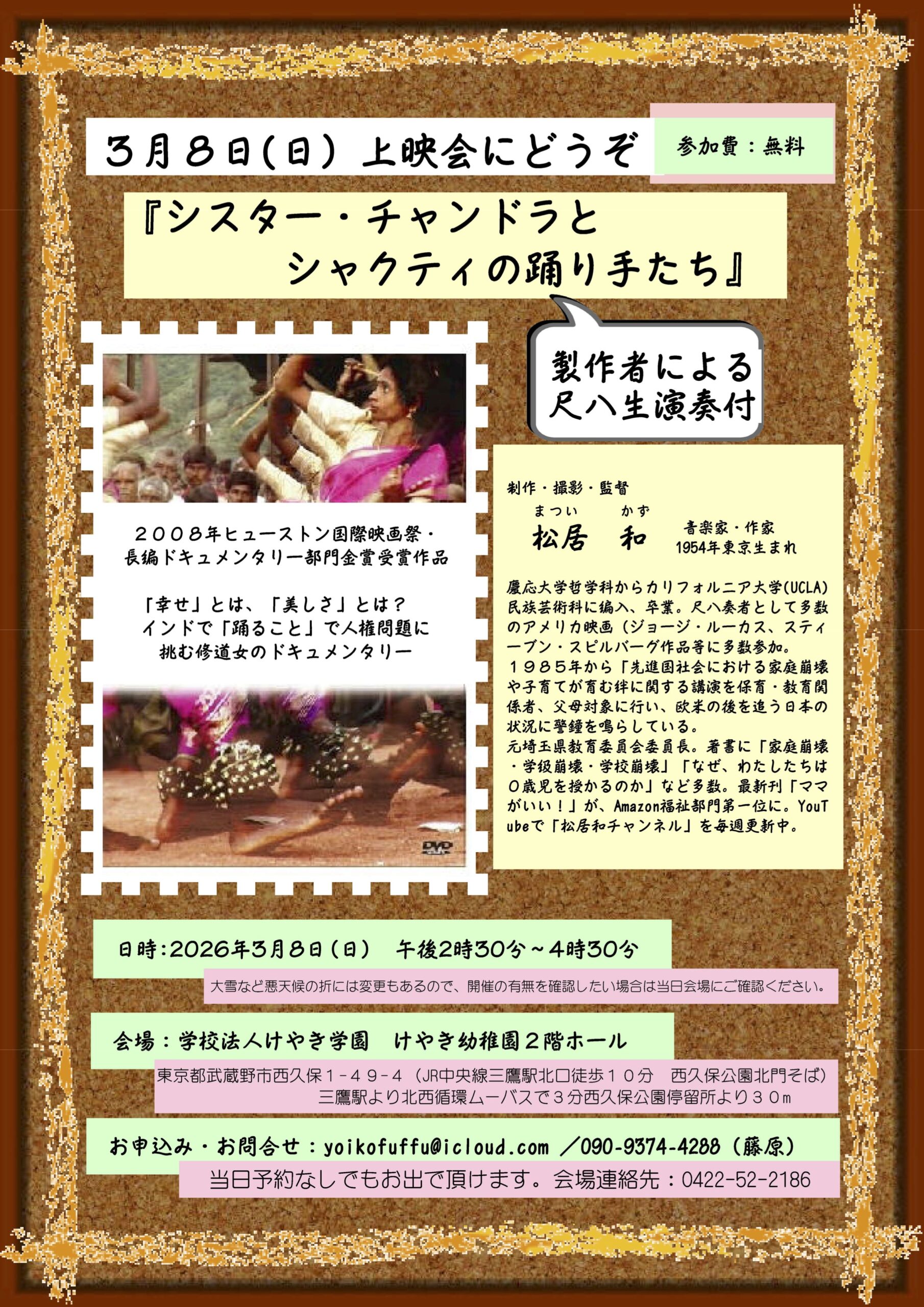 3月8日、武蔵野市で私の制作したドキュメンタリー映画、「シスター・チャンドラとシャクティの踊り手たち」の上映会があります。ヒューストン国際映画祭で「金賞」を受賞した作品です。ぜひ、いらして下さい。解説、尺八演奏もします。#シャクティ #松居和