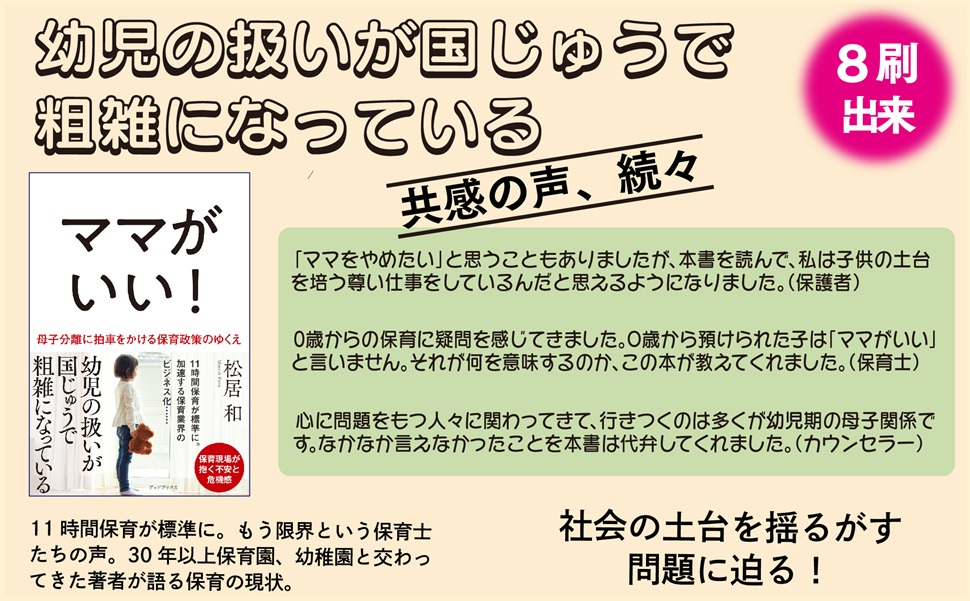 参政党の神谷さんと対談した時も、幼児たちを育てている奥様が、「ママがいい!」を愛読してます、と言われ、嬉しかったのですが、幼児と過ごしている人たちが、「真実」を感じてくれる、私が園長先生たちから学んだ沢山の教えが書いてあります。