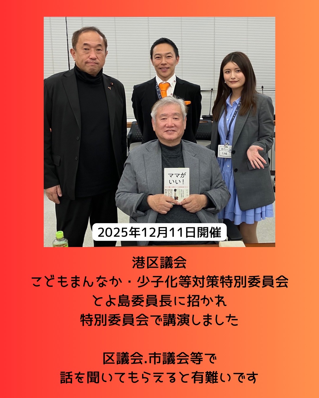 私が、お願いしている「保育士体験」、幼児たちと人間が再び、頻繁に交わること、交流することは市議会や区議会、市長や区長の賛同で、できることです。県議会や国会は、理解しても動こうとしない。